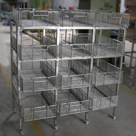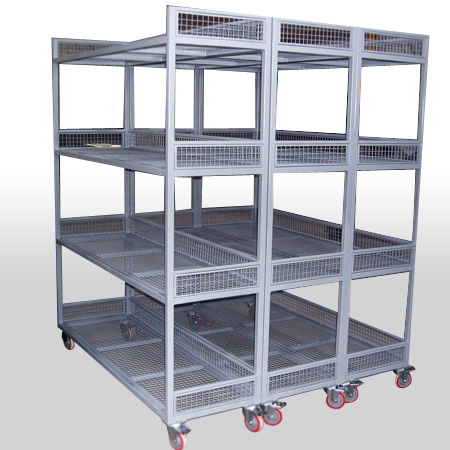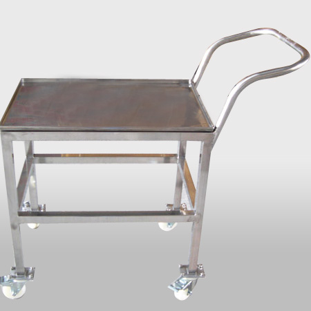 Làm bằng vật liệu sắt sơn tĩnh điện hoặc thép không rỉ, dùng cho công việc vận chuyển thực phẩm trong quá trình chế biến